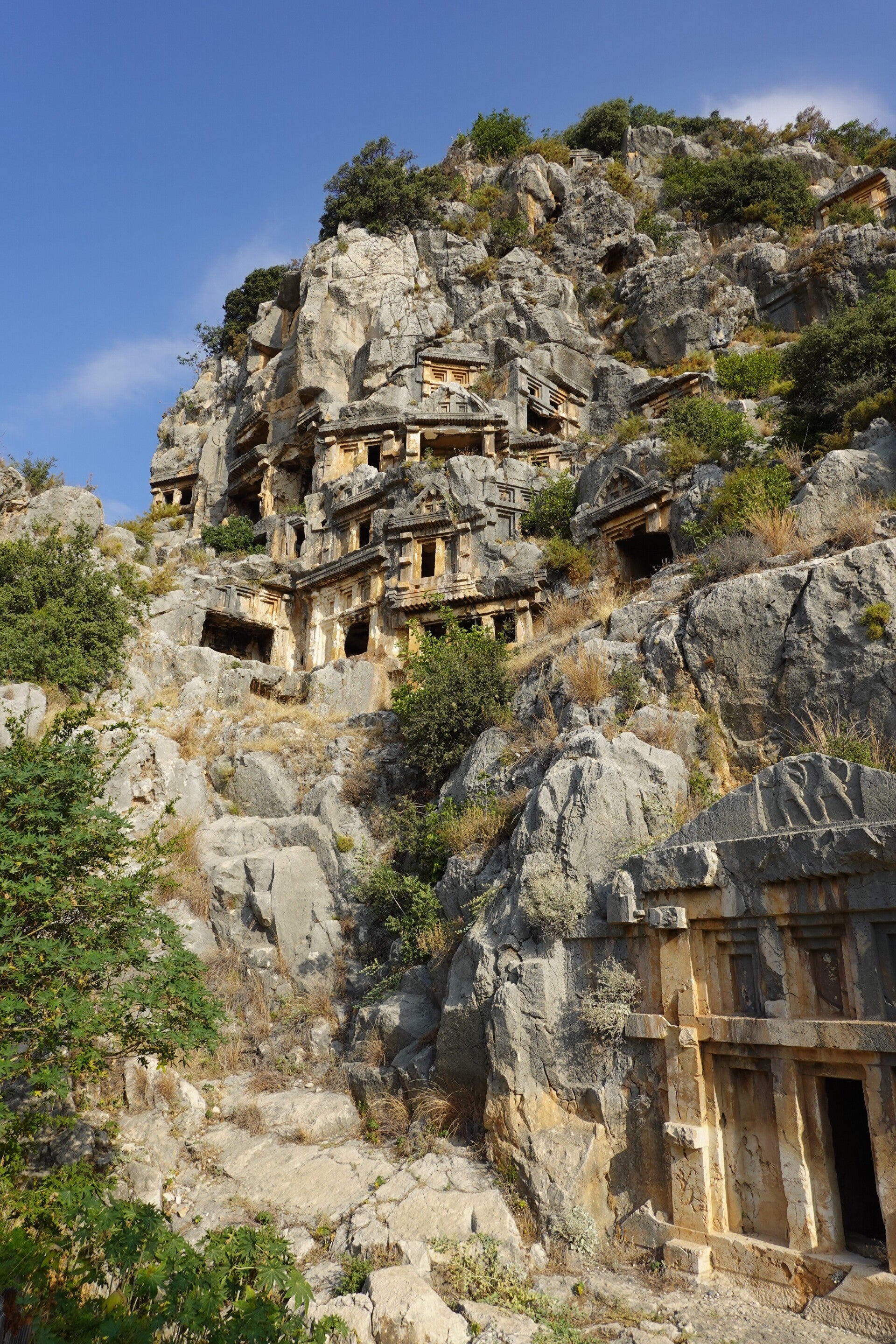 Eerst bezoeken we Myra. Ook deze stad lag destijds aan het water maar door modder en slip ligt het nu landinwaarts. In Myra bouwden de Lyciërs (4de eeuw voor chr) hun grafsteden, graven uitgehouwen in de steile rotswanden. Onder deze rotsgraven ligt een theater dat de Romeinen in de 2de eeuw na chr. hier bouwden. Hoewel het theater echt wel indrukwekkend is, maken juist de rotsgraven grote indruk.