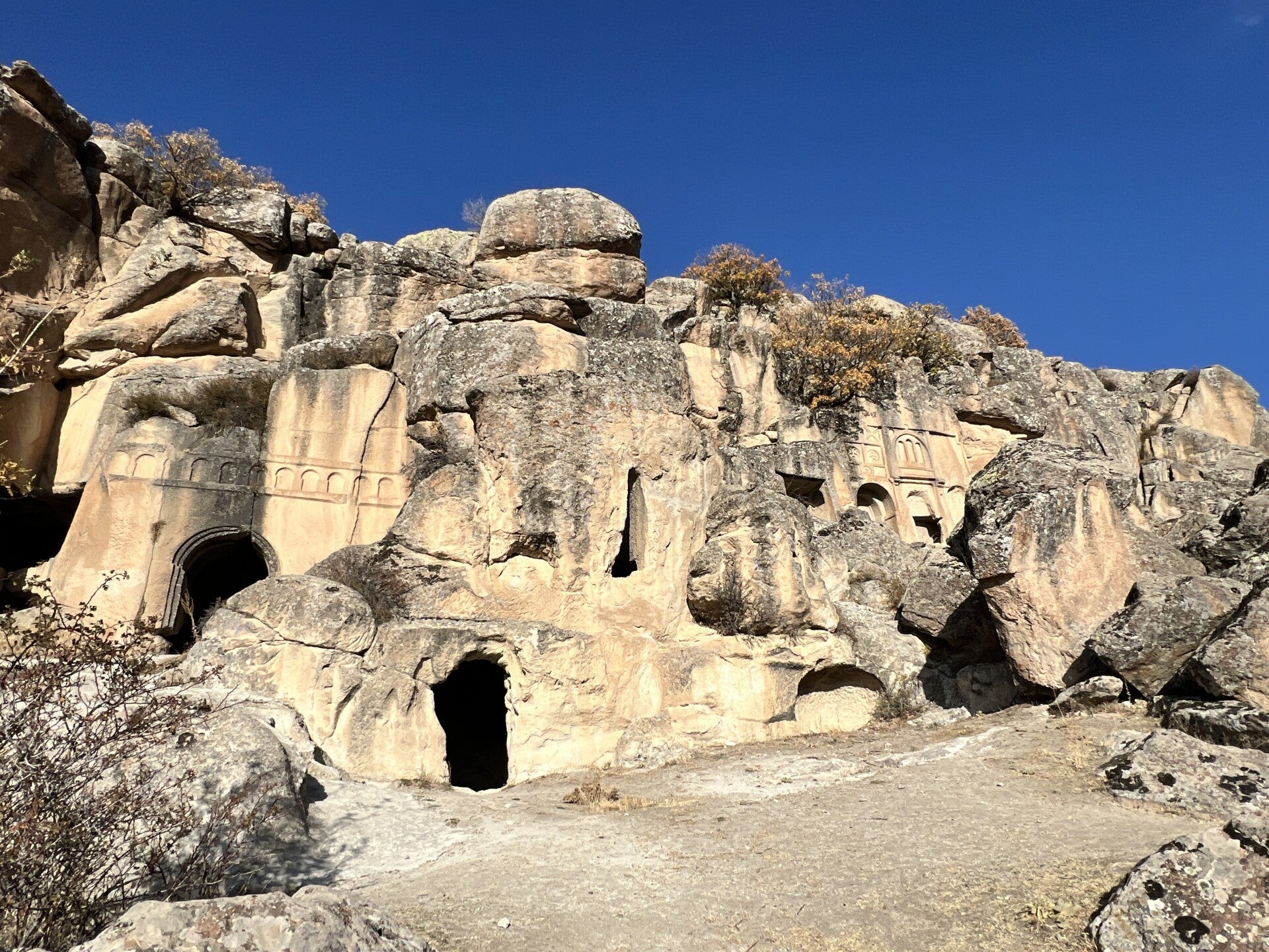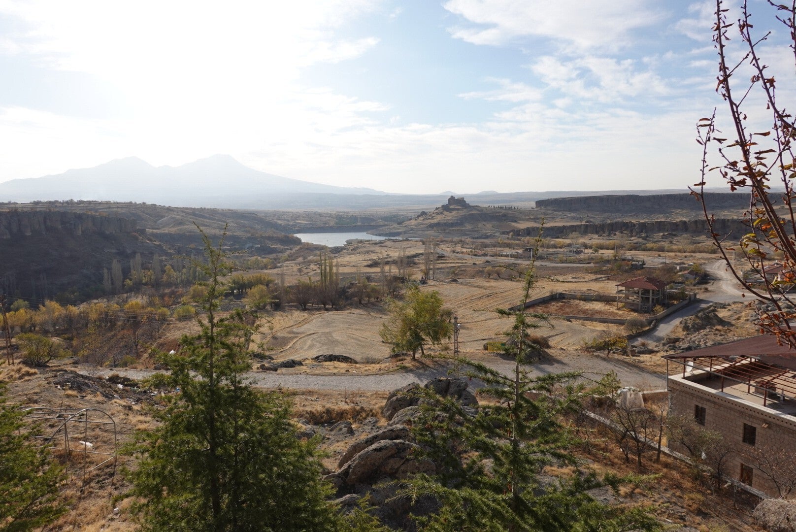 Eind november, de zon schijnt, we gaan niet binnen zitten maar besluiten te gaan wandelen in de Ihlara vallei. De 16 kilometer lange vallei ligt in de provincie Aksaray, vlak bij de bekende toeristische plaatsen in Cappadocië en dus zie je hier dezelfde bijzondere rotsformaties. Eerste rijden we naar Selime, ongeveer 2 uur en 45 minuten vanaf Ankara. Hier beklimmen we de Kathedraal van Selime, een enorm uit de rotsen gehouwen complex waar de eerste christenen woonden en hun geloof beleden (800 n.c.). Als we weer in de auto zitten komen we langs een leuk restaurant aan de Melendiz rivier. Tijd voor ontbijt, want we gaan straks een stevige wandeling maken en omdat er niet veel toeristen zijn is het maar de vraag of we later nog ergens iets vinden dat open is. Tijdens het eten bestuderen we de kaart en zien dat het mooiste stuk van de wandelroute tussen Belisırma en Ihlara ligt, hier liggen de meeste rotskerken. We rijden daarom naar Belisırma waar we vlakbij de rotskerk, de Ala Kilese, kunnen parkeren. Deze kerk heeft nog schilderingen maar deze zijn wel zwaar beschadigd. Het plan is om vanaf hier af te dalen naar de Meander rivier die dwars door de vallei loopt en deze te volgen naar Ihlara en vanuit daar weer terug te lopen naar de auto maar we raken in gesprek met een plaatselijk bewoner en die biedt aan om ons tegen een kleine vergoeding naar Ihlara, het eigenlijke startpunt, te brengen en zo hoeven we niet twee keer dezelfde route te lopen. We stappen in een oude Renault 12 zonder gordels en via een aantal haarspeldbochten met een snelheid, heel heel hoog, bereiken we, gelukkig zonder ongelukken, de ingang. Via een trap met de 426 treden dalen we af naar de vallei. Vanuit hier lopen we zigzaggend terug naar onze auto. Onderweg steeds even van het pad afgaand om via trappen diverse rotskerken te bekijken, helaas zijn veel muurschilderingen zwaar bekrast en beschadigd. Als we weer bij de auto zijn, gaan we naar een glazen plateau waar vandaan je op grote hoogte de vallei in kan kijken, het Ihlara Cam Teras, (leuk om te zien maar het voegt niet veel toe aan de uitzichten die we eerder hadden) daarna rijden we naar Güzelyurt om nog een aantal rotskerken te bezoeken. Aan het eind van de dag brengen we een bezoek aan het Acigol meer, een vulkanisch kratermeer. Al met al een heerlijke dag waar we veel gezien hebben en met heerlijk zonnig, 24 graden, weer!