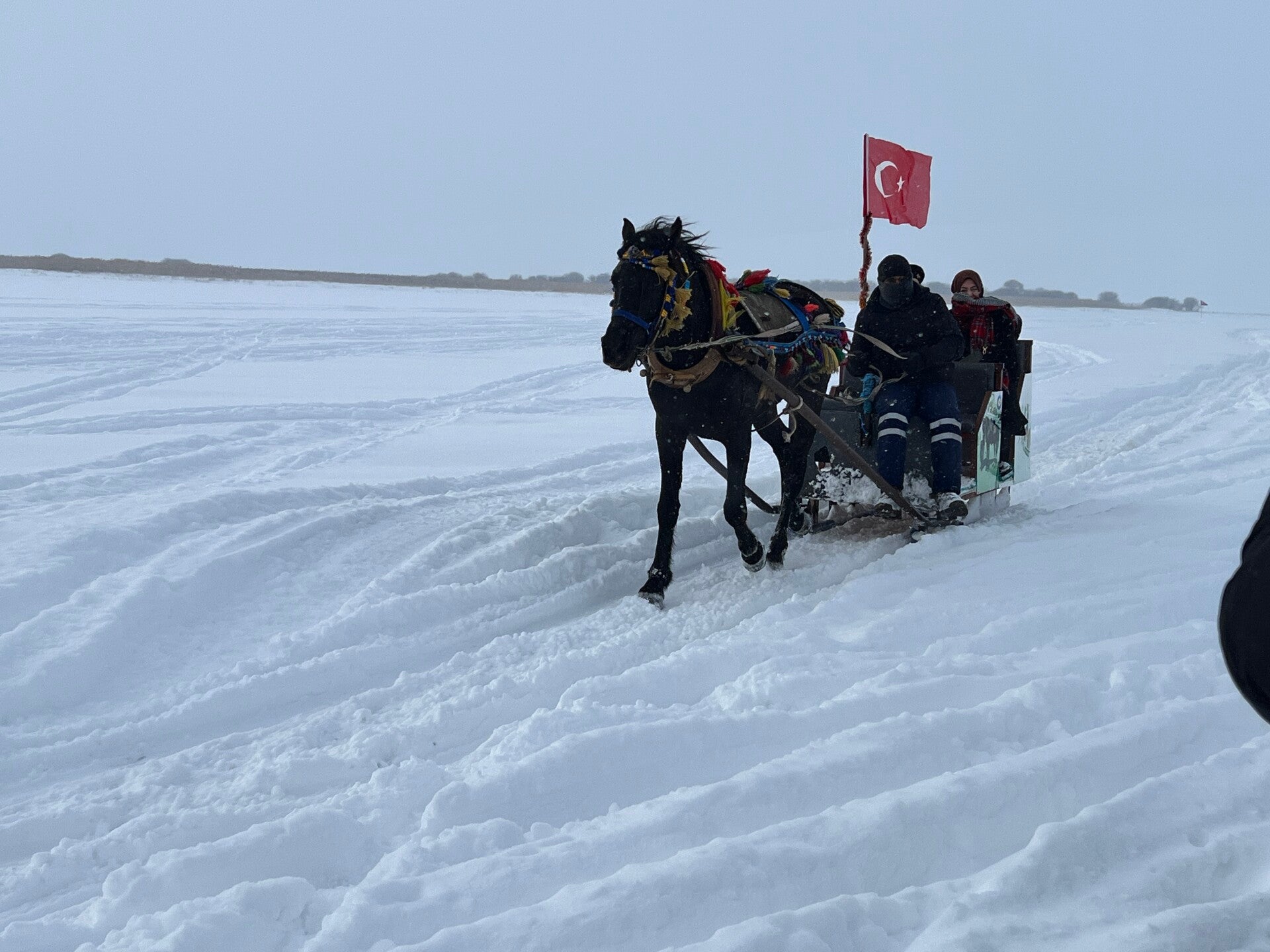 Voordat we de bus in gaan naar de volgende stop zoeken we nog naar een magneet maar helaas behalve een kop hete thee is hier nu niet veel te koop. De volgende stop is het Çıldır-meer, het grootste zoetwater meer in de provincie Kars en op 2000 meter hoogte. Aan het meer ligt een toeristisch restaurant waar we lunchen en dan lopen we het meer op. Waar je ook kijkt zie je sneeuw en ijs. Op het meer lopen paarden met sleeën en nu we hier toch zijn, betalen ook wij voor een ritje met de slee. Dan rijden we terug naar het hotel en sluiten we de dag af na een diner met muziek en dans.